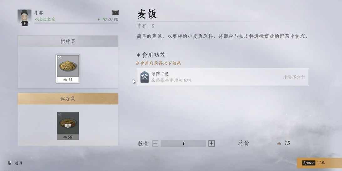 麦饭是游戏中一种能够提升采集效率的食物,食用后可以为玩家的资源收集活动提供增益效果。这种食物在游戏早期尤其有用,能帮助玩家更快地积累所需材料,推动角色发展和任务完成。通过合理使用麦饭,玩家可以在采药、挖矿、伐木、垂钓和狩猎等活动中获得额外收