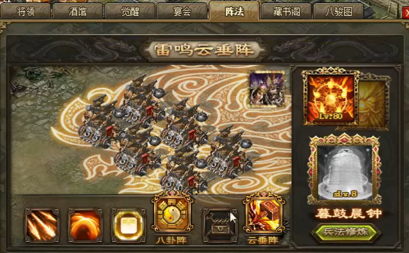 阵法系统是提升战斗力的重要组成部分,玩家需要达到210级并通关指定副本才能解锁阵法科技。解锁后,系统会提供三种基础阵法选择,分别为锋矢阵、雁形阵和方圆阵。这三种阵法初始仅开放三个位置,若想完全开启所有阵位,每个阵法需额外支付150金币,总计