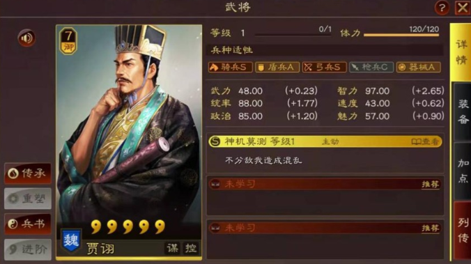 兵书选择直接影响程昱的生存与输出节奏。推荐虚实+攻其不备+鬼谋组合,若携带太平道法则可将妙算替换为将威。属性加点优先智力,副将位置更利于发挥,因其统率成长一般且战法无主将加成。骑兵S适性使其在魏法骑阵容中表现突出,弓兵A适性也可作为次选。