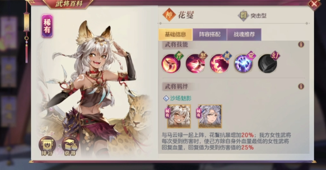 对于资源有限的玩家来说,花鬘是性价比极高的选择。她不需要投入大量资源就能形成战斗力,三火状态下已经足够应对大多数战斗场景。在阵容搭配方面,她与鲁肃、法正、公孙瓒、孙尚香等武将相性极佳,能组成攻守兼备的强力队伍。特别是配合法正的无视防御效果,可以轻松打出减员效果。她的撕裂和重伤机制在持久战中尤为致命,能有效克制依赖治疗的阵容。