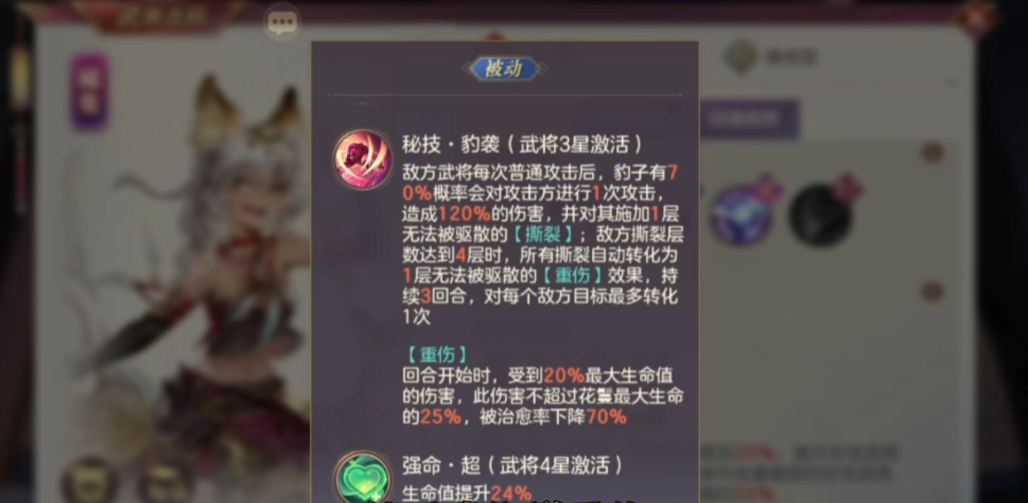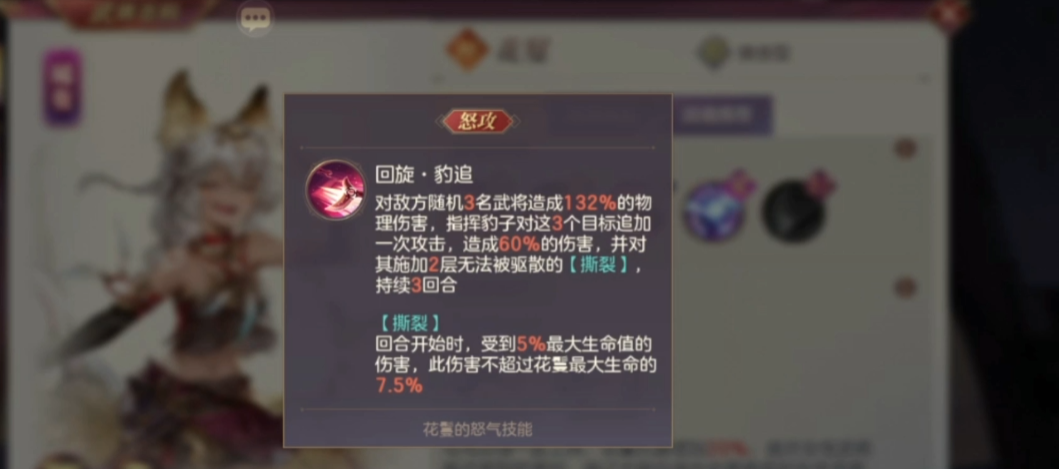 花鬘的技能机制相当优秀,敌方每次普攻后,她的豹子伙伴有70%概率进行反击,造成120%伤害并施加无法驱散的撕裂效果。这个效果每回合会造成目标最大生命值5%的伤害,叠满4层后转化为更致命的重伤状态,大幅降低目标被治疗率。即使面对高爆发阵容,她也能降低20%最终伤害和神兵技伤害,阵亡时还会对敌方全体造成伤害并附加撕裂。在女团阵容中,她还能为队友提供治疗支援,每次女将受伤都会为血量最低的同伴回复25%伤害值的血量。