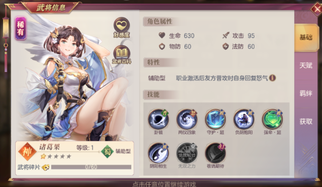 诸葛果在游戏中是一位非常强力的辅助型武将,她的技能设计充满了策略性,能够根据战场情况灵活切换阴阳状态来应对不同局面。作为蜀国阵营的神将,她不仅拥有出色的治疗能力,还能通过独特的阴阳机制为队友提供强力支援或削弱敌方输出。她的技能组合让她在战斗中既能保护队友又能干扰对手,是一位非常全面的辅助角色。