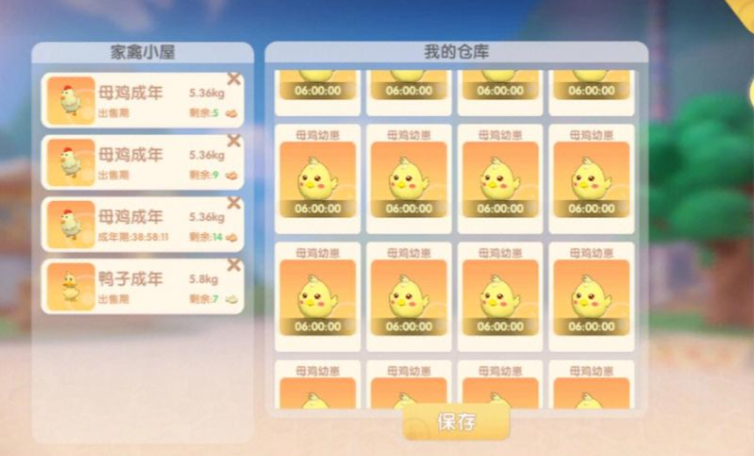 卖掉仓库里的小鸡幼崽其实很简单,首先得确保它们已经从仓库放回家禽小屋。直接点开家禽小屋,找到右下角的动物仓库按钮,里面会显示所有暂时存放的小动物。选中要处理的小鸡幼崽,点击保存按钮把它们放回饲养区,这时候才能进行出售操作。仓库里的小鸡是不能直接卖的,必须转移到饲养区才能操作哦。