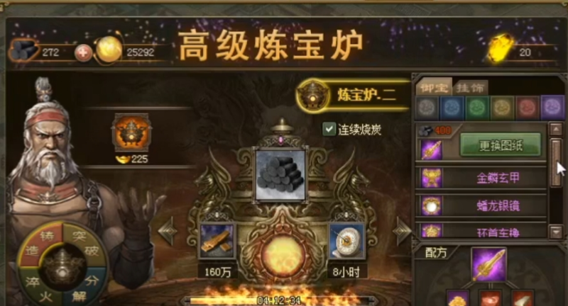 另一种高效获取木炭的方式是通过炼宝炉烧制。在兵器界面的铸造选项中,玩家可选择消耗木材烧制木炭,通常有两种方案:160万木材烧制80木炭需8小时,或20万木材烧制10木炭仅需1小时。烧制过程需提前规划木材储备,避免因资源短缺影响进度。初始游戏会赠送少量木炭,建议优先用于关键道具的铸造,例如踏云履等基础宝物。