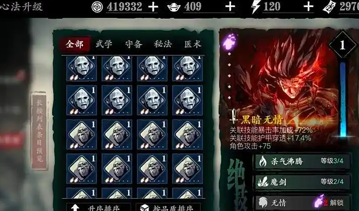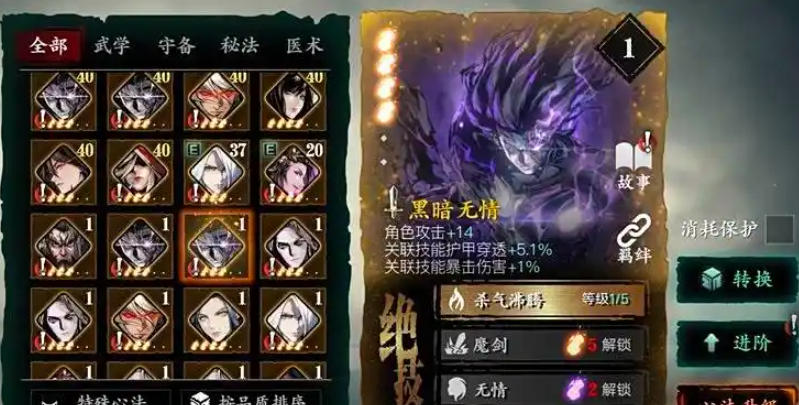 黑暗无情的养成需重点关注绝技解锁条件。其核心技能杀气沸腾需四火解锁,提供10%暴击率加成;五火时可激活魔剑召唤效果,造成250%攻击力的范围伤害;两紫火则进一步扩大攻击范围并附加10%真实伤害。建议优先通过吞噬低品质心法完成突破,再逐步提升星级以强化实战表现。