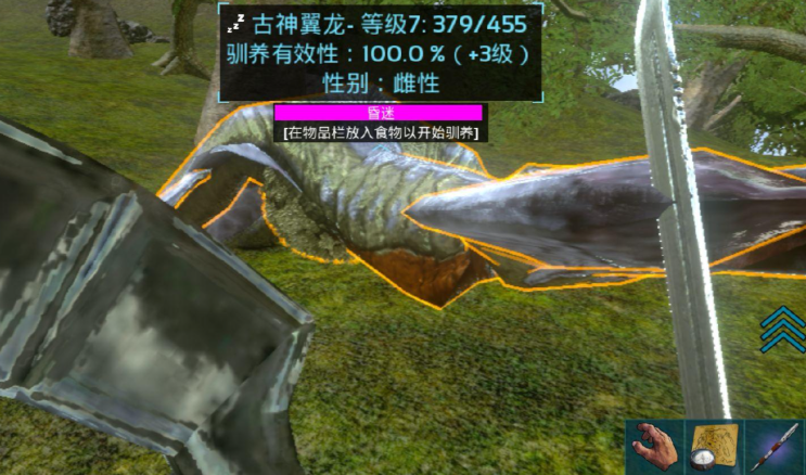 成功击晕后,立刻用木质拒马围住它,防止其他食肉恐龙偷袭。打开它的背包放入优质生肉或饲料,优先用异特龙蛋饲料加快驯服速度。驯服过程中记得补充黑色浆果或麻醉药维持眩晕值。如果驯服进度较慢,可以提前多准备些生肉,放在其他宠物背包里延长保鲜时间。耐心等待驯服条满,就能收获一只忠诚的古神翼龙了。