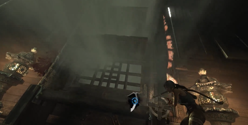 悬崖风很大的场景必须贴着崖壁慢慢走过去,走到缺口处直接往木板上面跳。跳上去之后赶快通过上面的木板爬上去就好了。沿着破洞窗沿进入峡谷寺庙的阁楼,进去之后需要先把敌人消灭,通过调查发现逃出这里的唯一方法是砸开阁楼地面的木栏才能逃生出去。