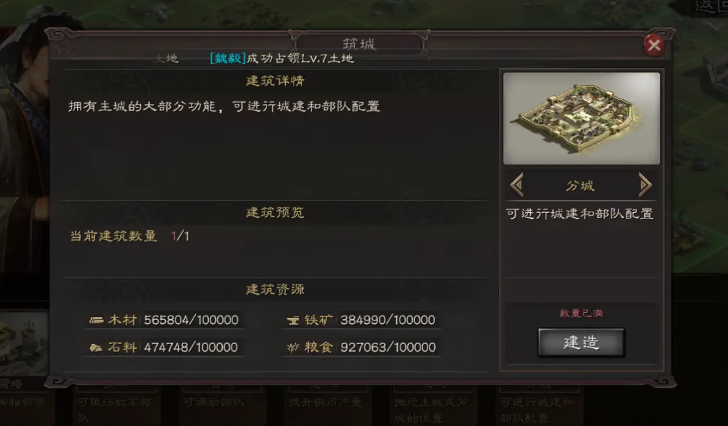 军营建筑的等级直接决定武将的带兵上限,优先升级可快速扩大兵力规模。分城虽等级较低,但同样具备兵营功能,需注意分城兵力仅能补充分城部队,无法支援主城派遣的军队。君王殿等级达到7级且声望满足6000后,可解锁分城建造,进一步扩展势力范围。分城建造需消耗铁矿、石料等资源,且选址需避开地形阻碍和敌对领地。