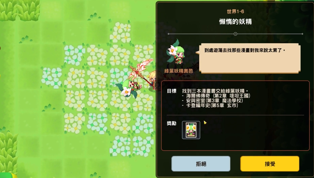 获得土花这个角色,玩家需要触发并完成一个特定的隐藏任务。这个任务起始于世界1的支线关卡隐秘花园,在1-1区域的隐蔽花丛中会遇到一个懒惰的精灵,她会委托玩家去寻找三本漫画书,只有收集齐全这些物品才能解锁土花。这个隐藏任务在整个游戏进程中属于早期可接触的内容,但需要玩家仔细探索地图才能发现触发点。