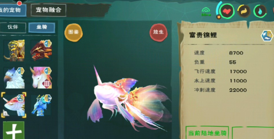 它性能很强,而且特别漂亮。它是游戏里早期的三栖坐骑,意味着能在陆地、水里和天上自由切换,非常方便。它的造型以红金为主色调,全身色彩斑斓,鱼鳍和尾巴是梦幻的蓝紫色,游动起来还会拖尾星光,特效十足。在属性方面,它的陆地速度有8700,飞行速度能达到17000,水上速度也有11000,如果冲刺起来速度更猛。这样的属性对于探索广袤的贝雅大陆非常有帮助,无论是跑图、跨海还是上天,都能节省大量时间。虽然获取方式有点门槛,但它所提供的便捷和视觉享受,让很多玩家都觉得值得一试。