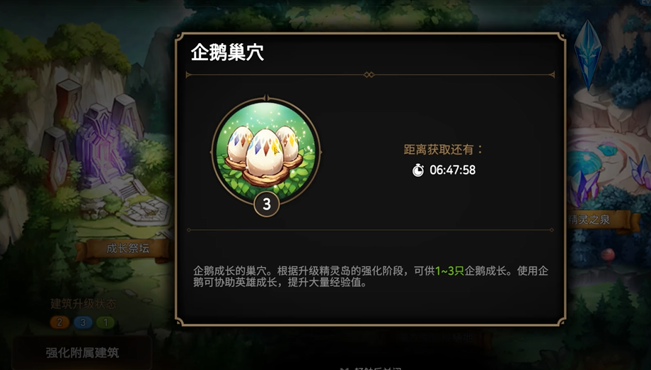 游戏里还有个稳定的企鹅来源,那就是精灵之森里的成长系统。你点进去之后,找到对应的成长界面,把材料放上去,等着它完成成长过程,结束之后就能拿到企鹅了。这个方法虽然需要一点时间等待,但非常稳定,不需要你去反复刷图,适合作为日常资源积累的一个补充。