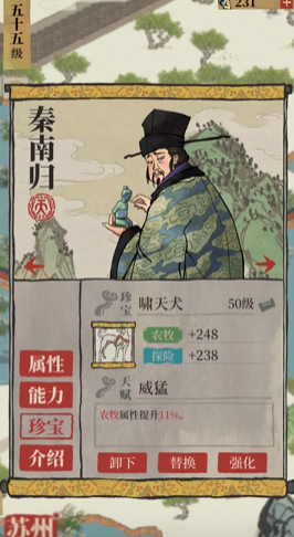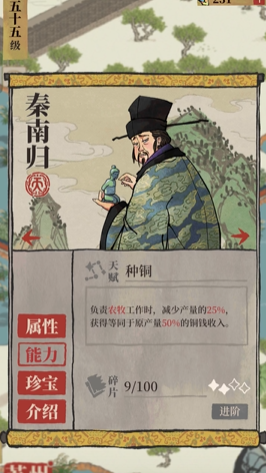 发挥秦南归价值的关键在于珍宝的精准搭配。普遍的共识是,珍宝应当选择理财类以强化其综合收益。若玩家金珍宝资源富余,搭配太极图可以使其理财属性达到965,获得64%的理财与农牧加成。对于大多数玩家而言,更经济实惠且效果突出的选择是蓝色珍宝澄泥砚,搭配后其理财属性为865,能提供57%的理财加成和65%的农牧加成,这种搭配能有效放大其技能中增加铜钱收益的部分。