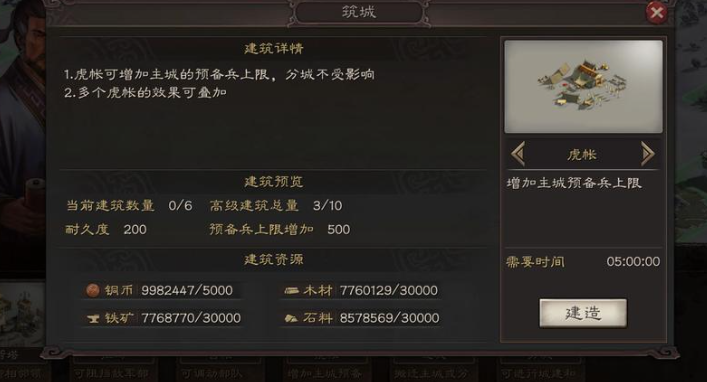 仅靠征兵处无法达到三万预备兵上限,玩家必须建造特殊建筑虎帐来进一步扩充容量。虎帐只能在主城中建造,并且有严格的前提条件:需要先占领八级资源地,同时名声值达到6000才能解锁第一个虎帐的建造资格。名声值可通过时间积累或完成游戏内任务逐步提升,而占领高级资源地不仅能满足建造要求,还能增加资源产出效率。虎帐是专门设计用于增加预备兵上限的设施,分城无法建造,因此玩家需集中资源发展主城以满足这些条件。