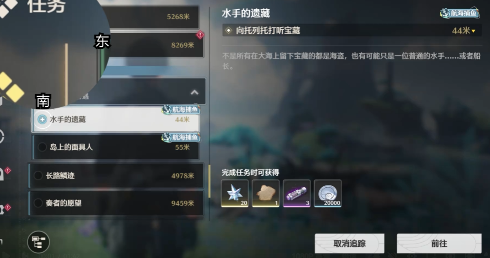 尝试捕获隐藏鱼王龙鲡,这并非一项可以立刻开展的活动,而是有着严格的前提条件。玩家首先需要完成名为水手的遗藏的支线任务,这个任务将为你揭开后续探索的序幕。完成前置任务后,真正的收集环节才刚开始。你需要前往地图上三个指定的铛铛蟹祭坛地点,它们分