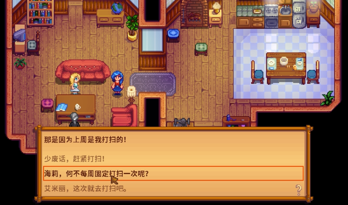 触发海莉的二星事件需要咱们先和她成为普通朋友,至少达到两星好感度。每周六去她家时有机会遇到她和姐姐艾米丽正在为谁该打扫沙发坐垫争吵。这时候靠近海莉对话,系统会给出三个选项,选第三个海莉,何不每周固定打扫一次呢?能让两人勉强达成一致,同时提升
