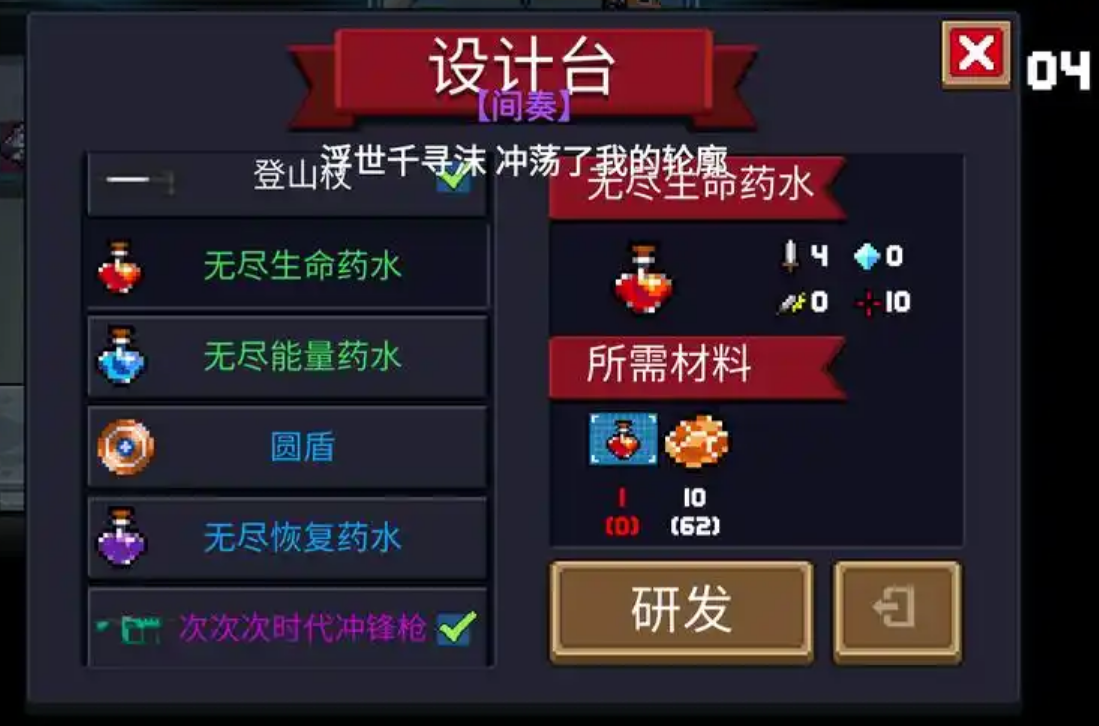 获取方式上,无尽能量药水属于蓝图武器,需要先在设计台研发后才能通过常规途径获得。研发消耗600宝石,制作材料为8个生物质,属于中后期实用性较强的可重复制作道具。它的优势在于稳定续航,尤其适合高耗能武器搭配,比如加特林、激光鱼等持续输出型装备。药水每层地牢仅能使用一次,进入下一层后空瓶会自动重新装满。