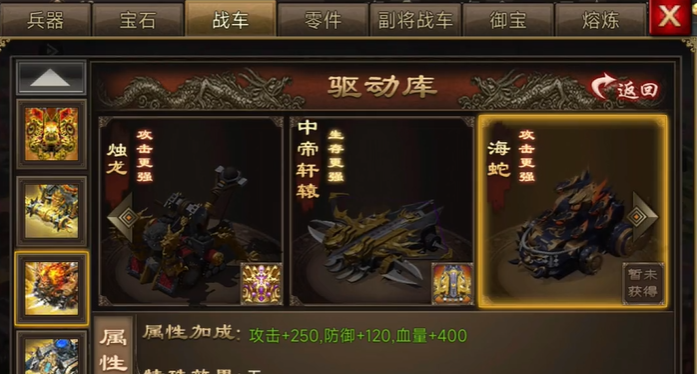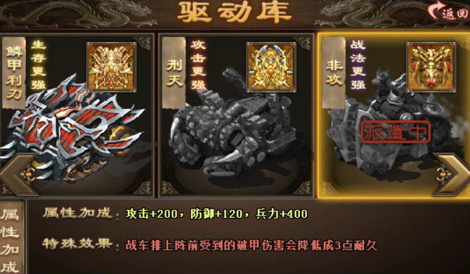 烛龙驱动是攻城掠地中第三战车的专属驱动系统,属于游戏内的高阶战斗强化机制。该驱动可为全体武将提供250点攻击、120点防御以及400点兵力的属性加成,同时会改变第三战车的面板造型及战斗中的攻防外观。需烛龙驱动仅具备属性增益,不附带任何特效。其激活需通过完成特定任务或条件,例如剧情任务、战斗成就或资源道具收集,解锁后在专属界面启用。驱动效果根据类型分为战斗增益(如攻防提升)和建设增益(如资源产量加速),玩家需根据战略需求选择适配的天魔战车。