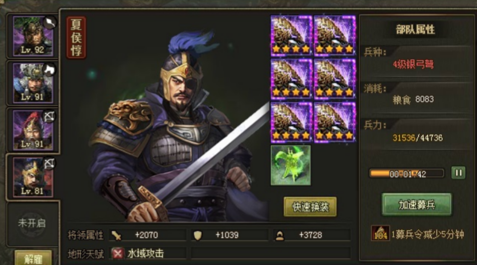 装备方面要重点强化强攻和强防属性,三星装备足够但技能等级不能低。瞎子(夏侯惇)的装备最好有两个强防技能,甘宁则需要强壮属性提升生存能力。兵器左边建议40/26/31,右边110,这种配置能在保证输出的同时兼顾防御。别小看这些细节,它们往往决定了战斗的胜负。