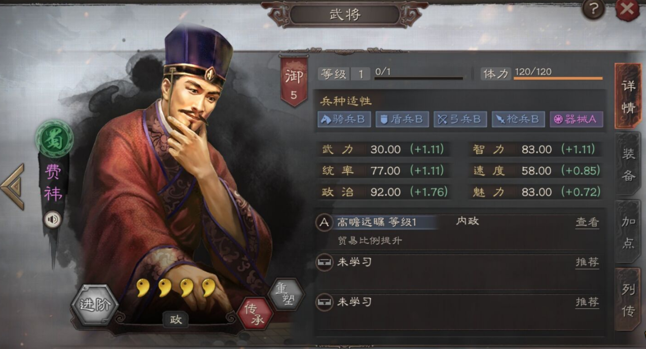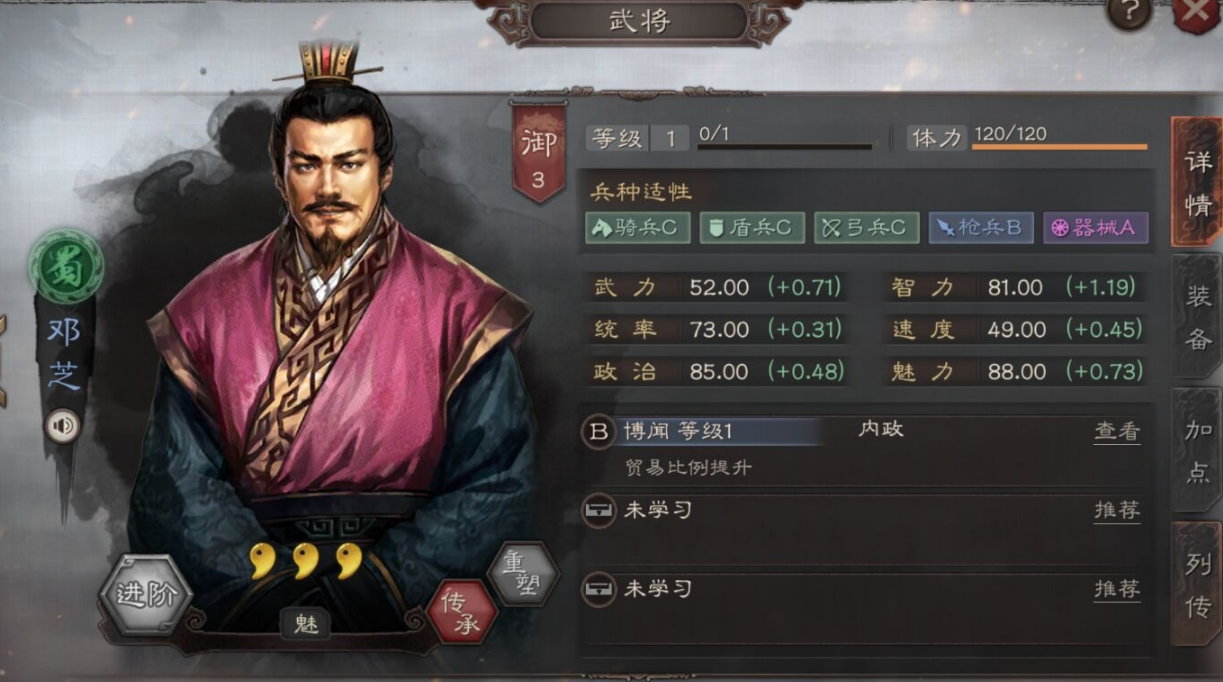 贸易官的选择直接影响到咱们能换到多少资源。建议优先挑选政治和魅力值高的武将,比如大乔、费祎、邓芝,他们的战法能显著提升贸易比例。每1点政治属性会增加0.01%的贸易加成,而1点魅力能提升0.02%,所以魅力高的武将更吃香。如果暂时没有五星武将,四星的糜竺或者简雍也能顶一阵子,记得把他们的属性点全加在魅力上哦。