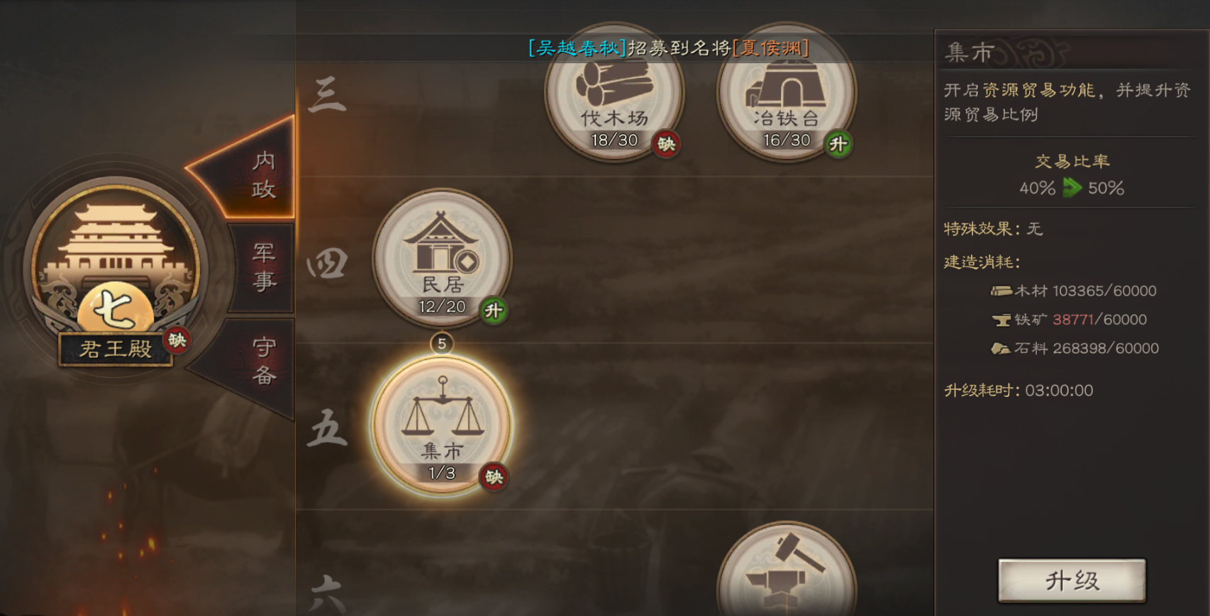 贸易功能是咱们平衡资源、快速发展的核心玩法之一。想要开启贸易,首先得把君王殿升到5级,这样才能解锁集市建筑。建好1级集市后,咱们就能在政厅界面找到贸易选项啦。这里可以自由选择用多余的资源兑换稀缺资源,比如木材换铁矿或者粮食换石料,非常灵活。贸易比例会根据咱们委任的贸易官属性来调整,所以选对武将很重要哦。