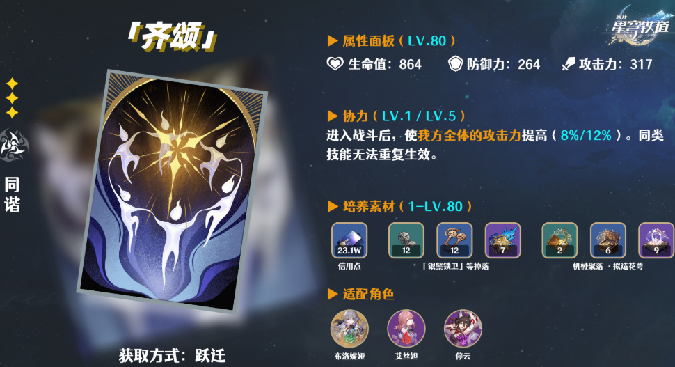 齐颂作为通用型三星同谐光锥,提供全队攻击力加成效果,虽然数值较低但胜在稳定触发。该光锥不依赖特定触发条件,适合追求操作简便的玩家使用。其优势在于能强化布洛妮娅大招的全队增益效果,缺点是缺乏能量回复属性,可能影响技能循环流畅度。