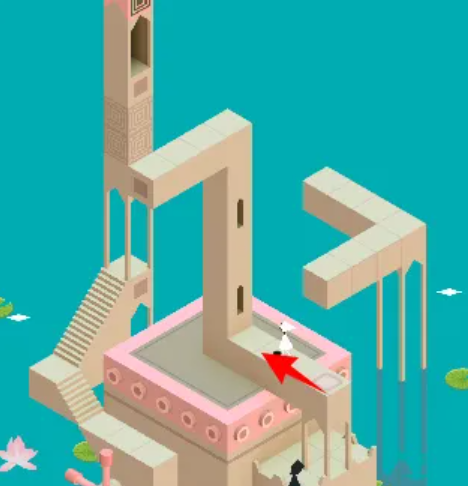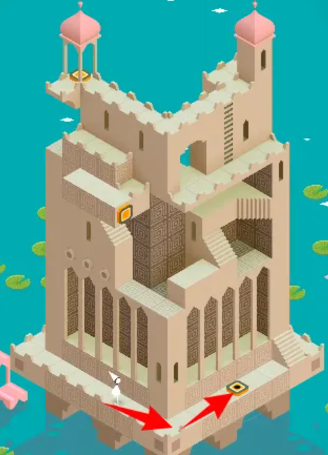 本关的核心玩法是利用旋转机关和视觉错觉,为公主艾达拼接道路,引导她穿越不断变化的迷宫式建筑。关卡开始后,你首先会处在一个有旋转把手的场景。转动这个机关,使隐藏的楼梯完整地显现并连接起来。然后让艾达走上楼梯,来到道路尽头的亭子。