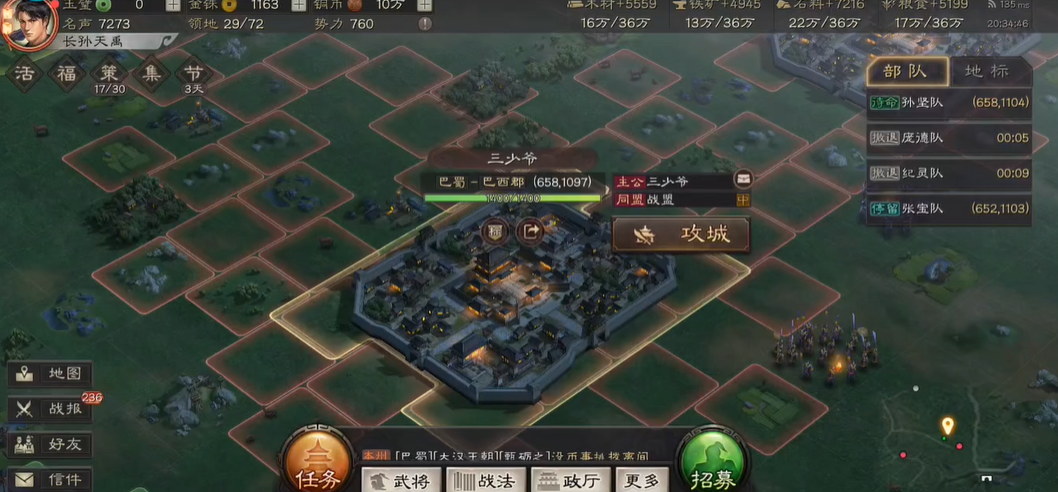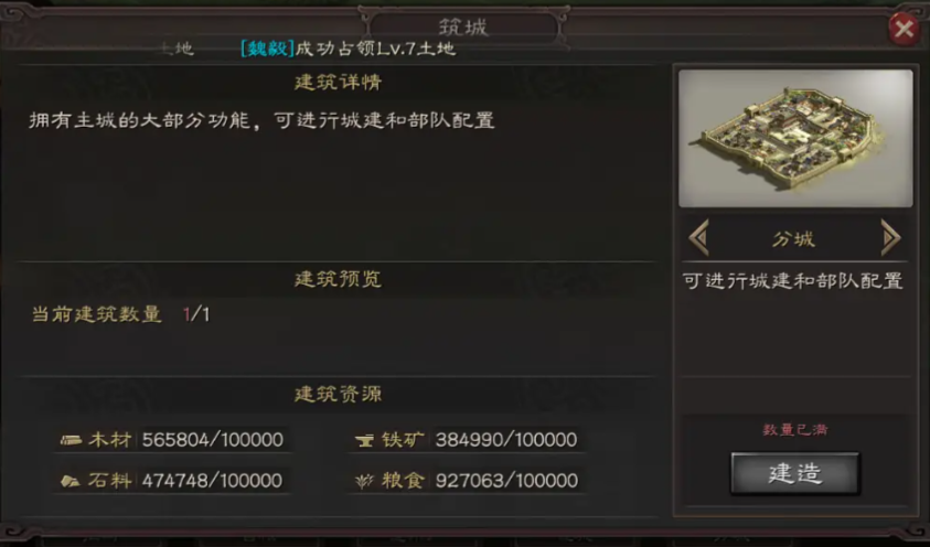 想在三国志战略版里建新城,首先得满足几个硬性条件。你的名声值必须达到6000点,否则连分城功能都解锁不了。然后得找一块合适的地盘,这块地得是11格连在一起的H型土地,而且正中间那块地至少得是6级或以上。资源也得备足,木材、铁矿、石料、粮食各