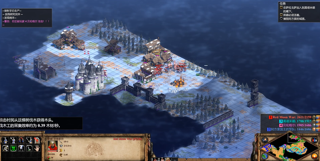 进入封建时代后不做任何军事扩张,核心任务是快速衔接城堡升级,从伐木或食物采集调配2-3名农民,立即建造市场与铁匠铺,满足升城的建筑前置要求。封建时代仅生产2个农民,将总人口提升至30,同时调整资源配比,适当增加黄金采集人数至5-6人,木材采集保持稳定,食物采集逐步转向农田种植,保障升级与后续发展的食物供给。所有操作围绕升级城堡展开,不研发封建科技、不训练军事单位,建筑完工且资源达到800食物、200黄金时,立刻点击城堡时代升级,最大化压缩封建时代停留时长,让科技攀升节奏保持极致连贯。