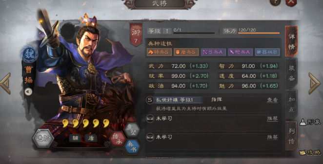 曹操在游戏中是一位非常全面的武将,既能扛伤害又能辅助队友,还能打出不错的谋略输出。他的高统率成长让他在前排站得住,智力成长也不差,双防都很优秀,面对各种伤害类型都不虚。适性方面有两种S级和两种A级兵种,搭配起来非常灵活。自带战法乱世奸雄是核