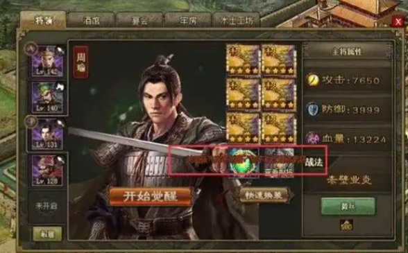 周瑜在攻城掠地中的核心战法为赤壁业炎,具备两次战法释放能力,附带混乱效果,可对敌方多排单位造成持续伤害。该战法在山地地形中表现尤为突出,统率属性高达82,但勇值较低(58),导致战法易被高勇武将如太史慈、陆逊抵挡,或被司马懿反弹克制。实战中